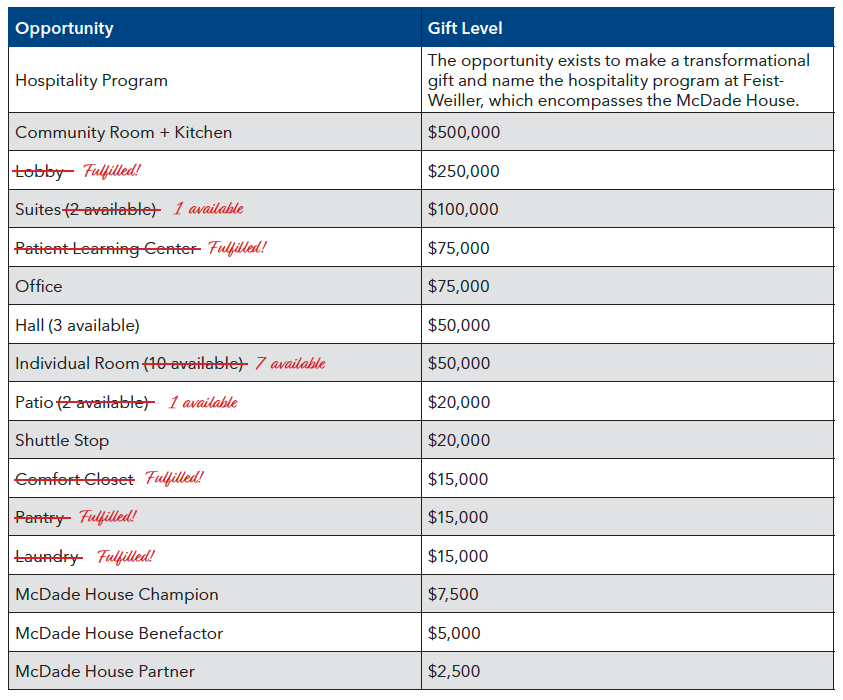 Donors play a major role in making this hospitality home possible for Feist-Weiller patients, faculty, and staff. Our campaign goal is to raise approximately $2.1 million to include the cost of renovation and three years of operating expenses for the McDade House.
